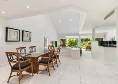 Combining modern design with elegance, the fully equipped kitchen comes with stone bench tops, provides ample room for prep work, and offers an interactive space for guests. The dining room leads through to a large sunk-in lounging area, via a few steps down. Glass sliding doors open out onto an entertaining veranda for further enjoyment. Finished with sandstone pavers and comfortable outdoor furniture, it is a great space to relax and soak up the tropical surrounds.
