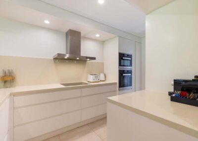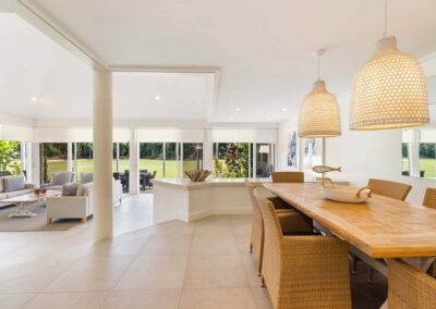 It’s comfortable and capacious, with high vaulted ceilings and open plan living. The kitchen is well equipped with European appliances. The dining room leads into the lounge, accessed via a few steps down. Walls of windows invite the natural light and glass sliding doors extend the living area out to the alfresco entertaining space, perfect for evening drinks and soaking up the balmy atmosphere.
