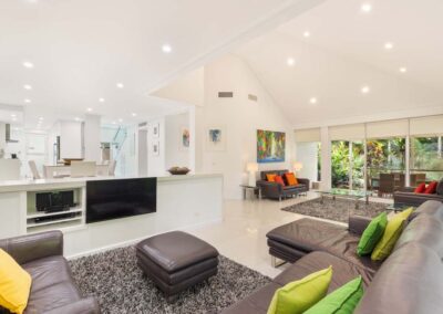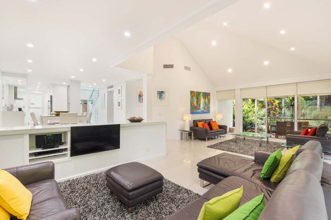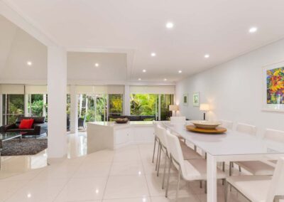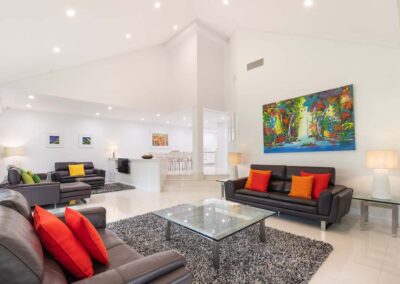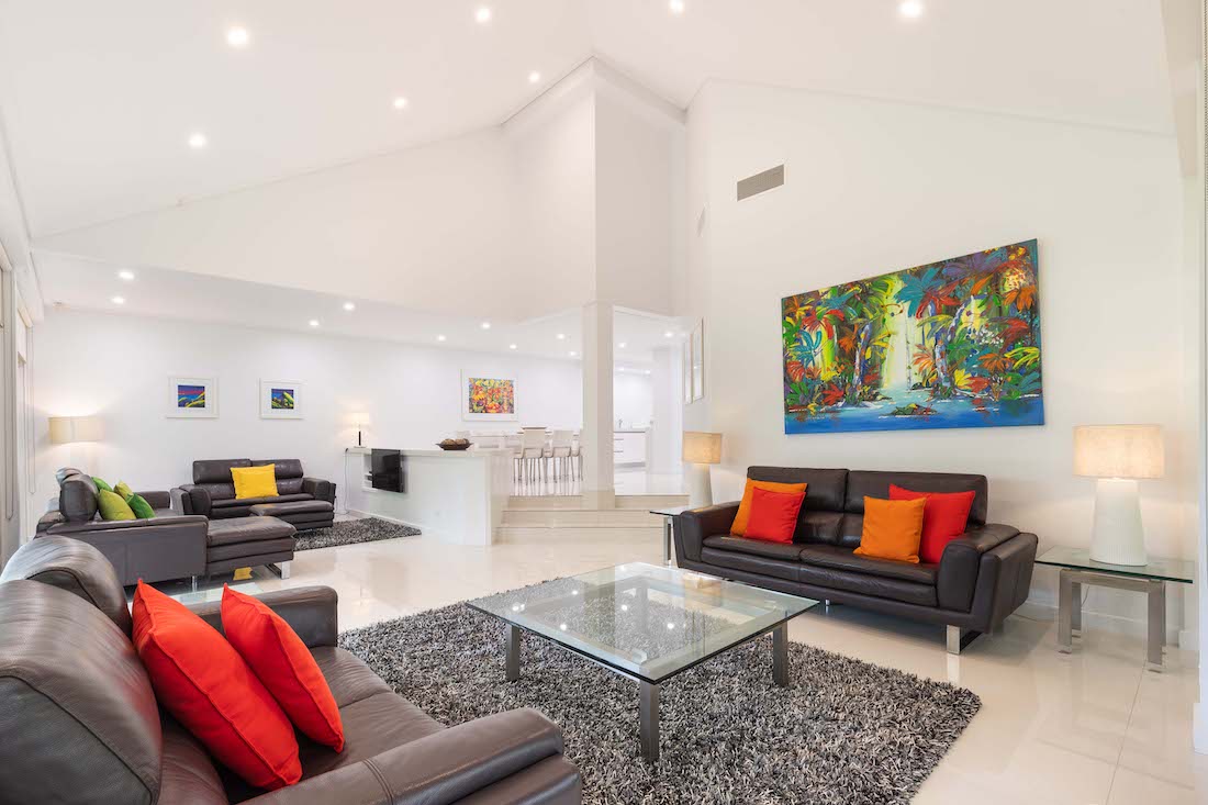 Tiled throughout, the black and white palette gives the villa a stylish, classic look, whilst the pop of brighter artwork and cushions evoke a playful and energetic feel. Fully air conditioned, its high vaulted ceilings invite light into the open plan living space. Being split level, the living and outdoor entertaining areas are accessed via a few steps down from the dining room.