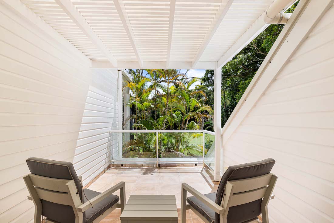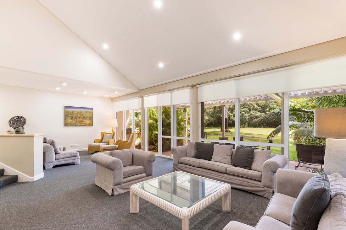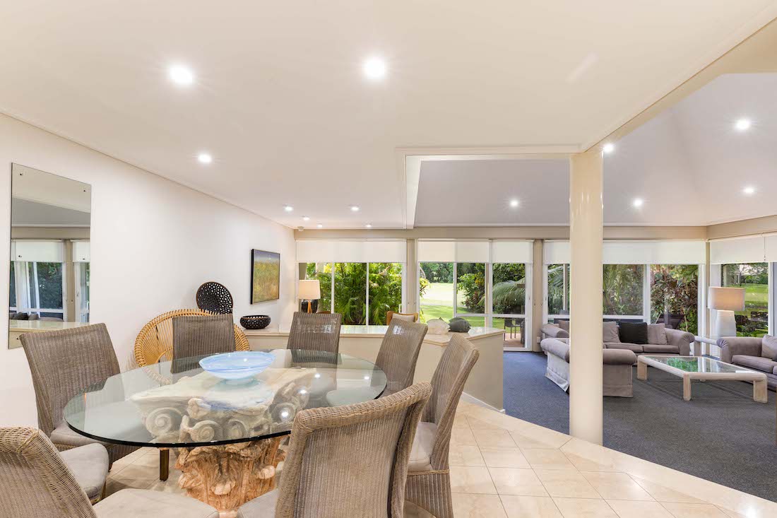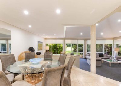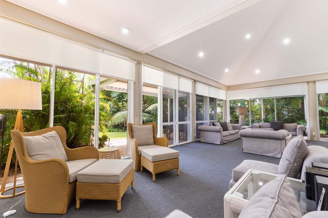 Tastefully furnished, the kitchen is fully equipped and fitted with quality appliances. Being split level, the living area is accessed via a few steps down from the dining room, offering an open plan layout. This space is divided into two zones for relaxation. With high vaulted ceilings, it’s framed by a panel of glass windows and sliding doors that open onto an entertaining verandah. Here is where you can fully take advantage and enjoy the tropical, balmy weather.