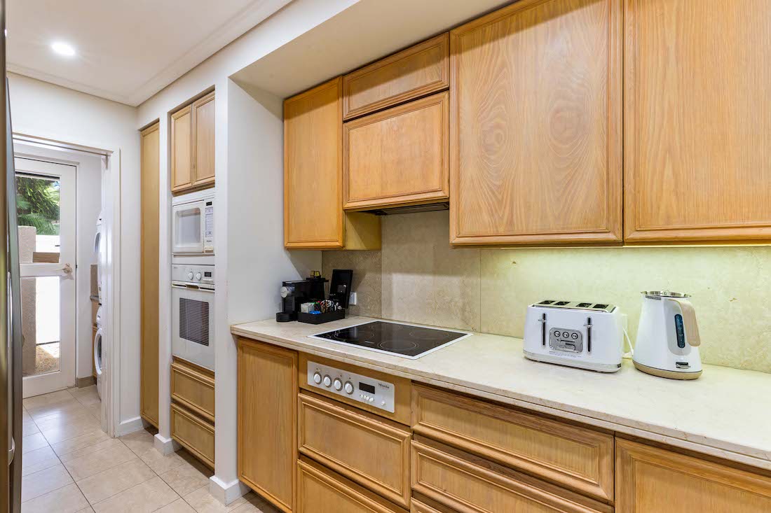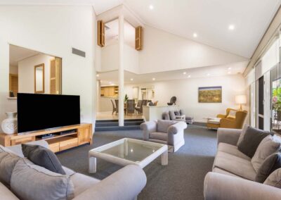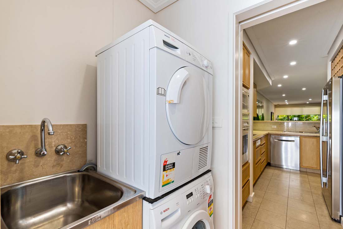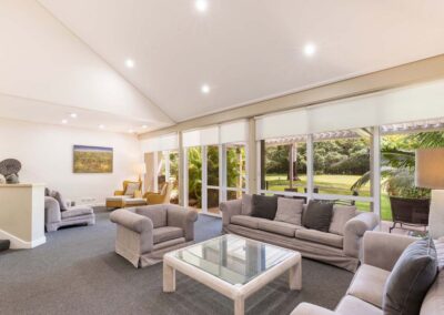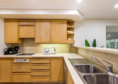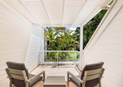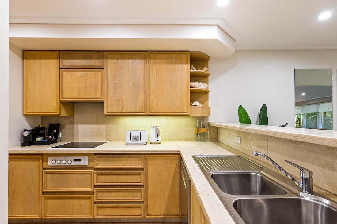 Tastefully furnished, the kitchen is fully equipped and fitted with quality appliances. Being split level, the living area is accessed via a few steps down from the dining room, offering an open plan layout. This space is divided into two zones for relaxation. With high vaulted ceilings, it’s framed by a panel of glass windows and sliding doors that open onto an entertaining verandah. Here is where you can fully take advantage and enjoy the tropical, balmy weather.