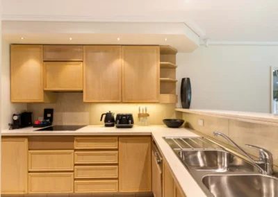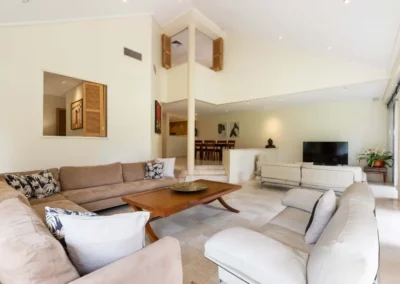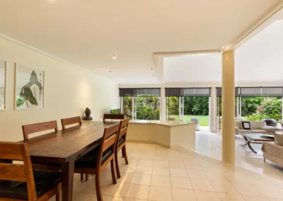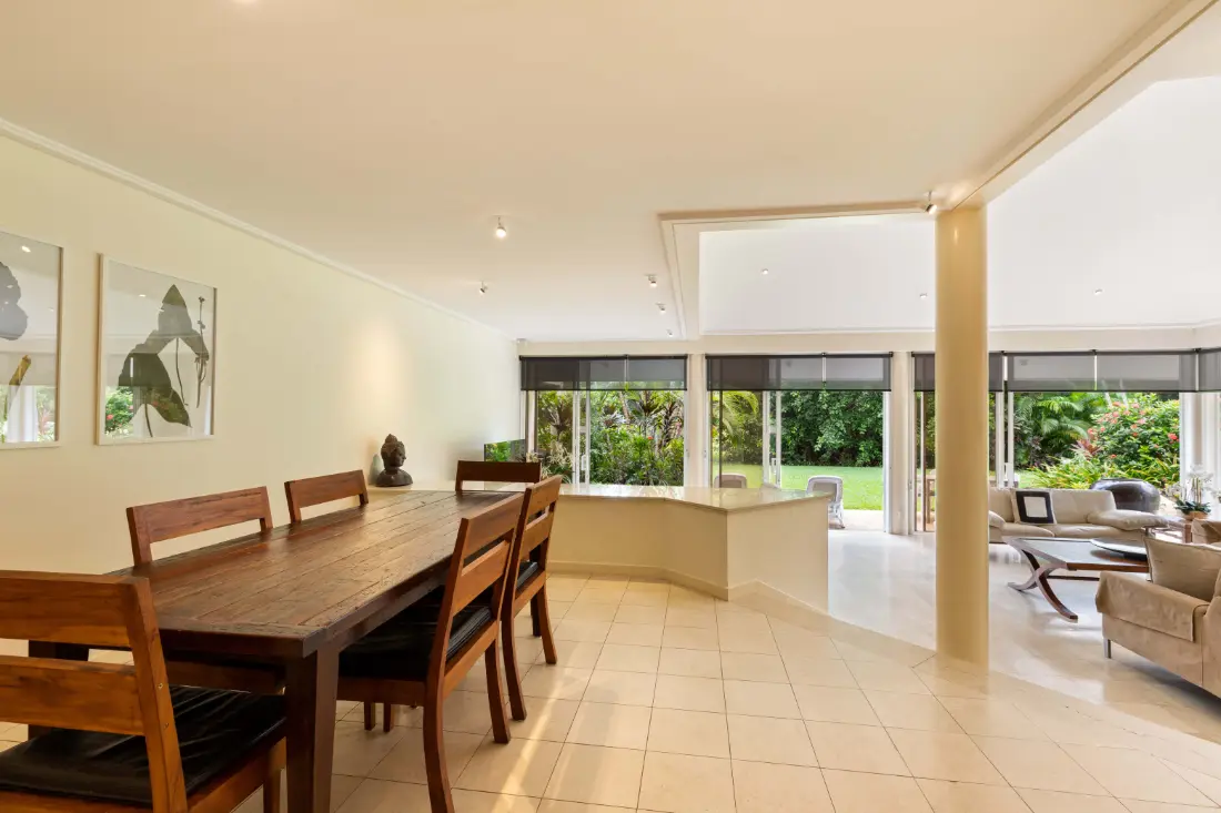 Being split level, the living and outdoor entertainment space is accessed via a few steps down from the dining room. The alfresco area is perfect for your entertainment needs, allowing you to soak up the atmosphere and tropical vibe. Ceiling to floor windows and glass paneled sliding doors wrap around the living area, inviting light and providing beautiful views to the gardens, which fringe the property perfectly. The kitchen is fully equipped, making self-catering easy for families, giving you the option to dine in with ease, if you choose.