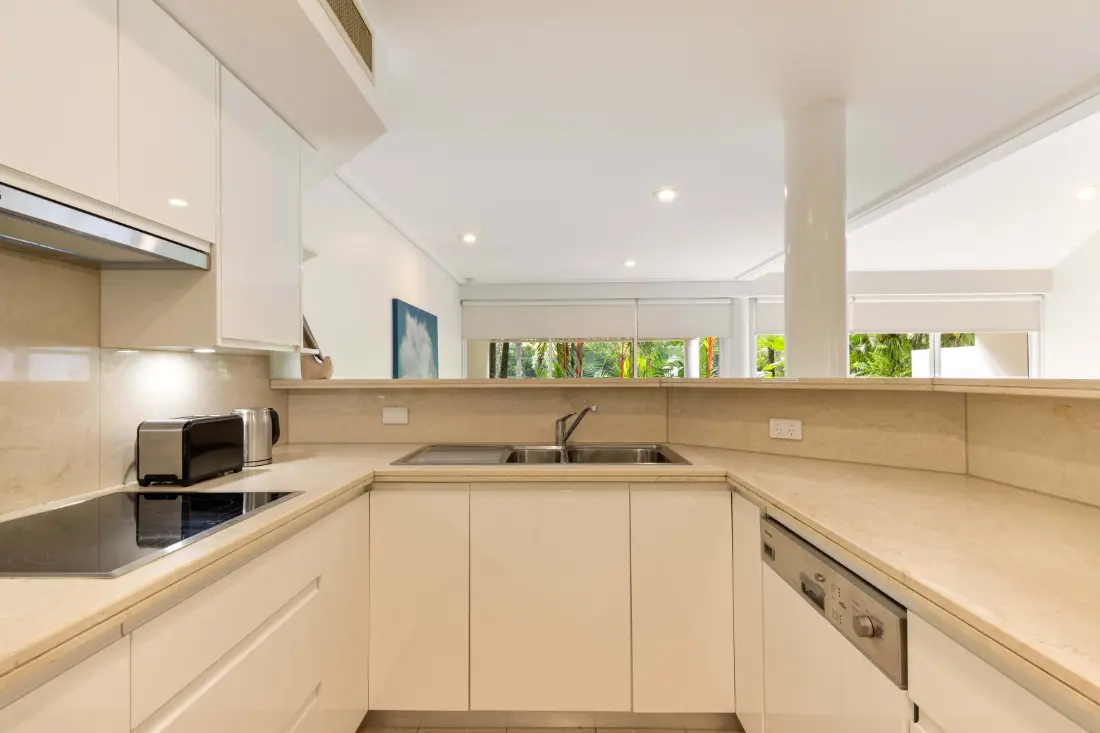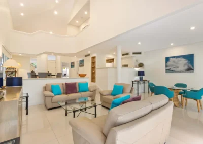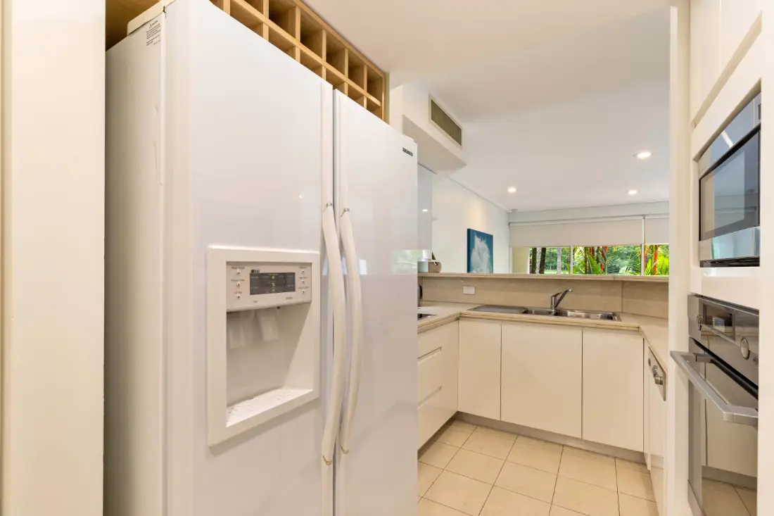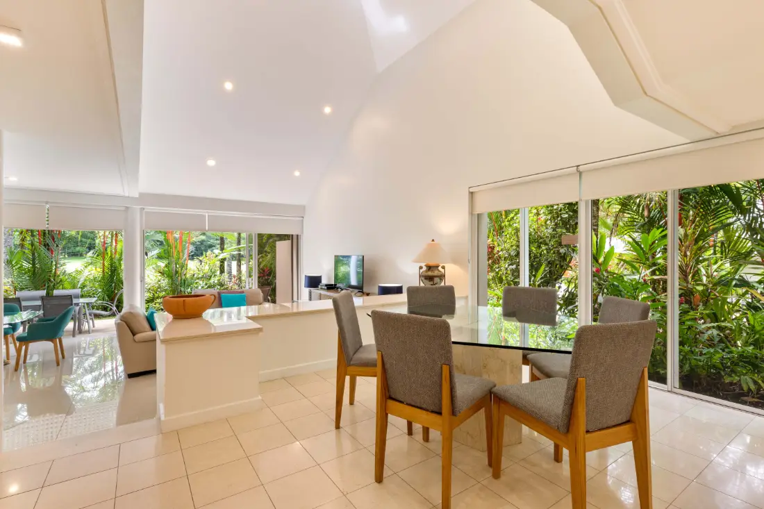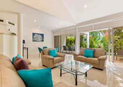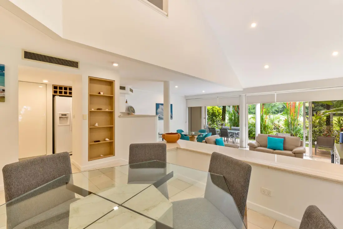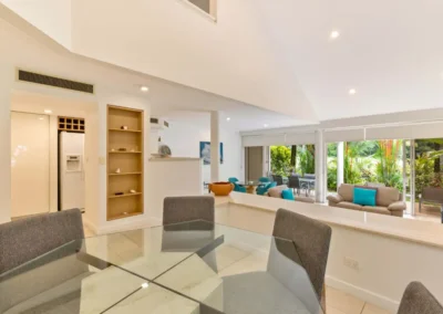 Villa 446 is within Avenue of Palms, on the resort’s southern side. The entrance pathway providing access from the private carport, is fringed with lush, tropical plants and the gardens are maintained to a high standard. Accessing the iconic Four Mile Beach is a short stroll across the 4th Fairway. The private villa swimming pool is shared by only a limited number of villas and is just meters from the front door.